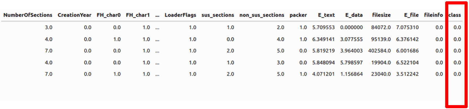 - class 열의 값이 각각 1,0인 행만 추출하여 pe_mal, pe_nor에 저장한다. 악성/정상으로 나누어 데이터를 비교하기 위함이다.