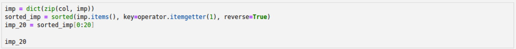 네번째 코드는 '특징데이터의 열'과 세번째 코드에서 추출한 '특징중요도'를 짝 지은 쌍을 중요도 기준으로 상위 20개를 내림차순으로 출력한다.