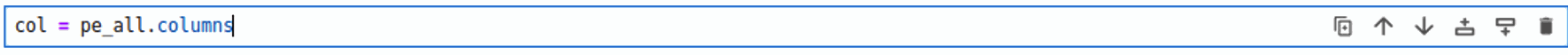 - pe_all의 칼럼(열)의 이름을 가져와 col에 저장한다. col은 열 이름을 가진 리스트가 된다.