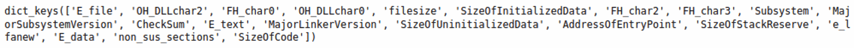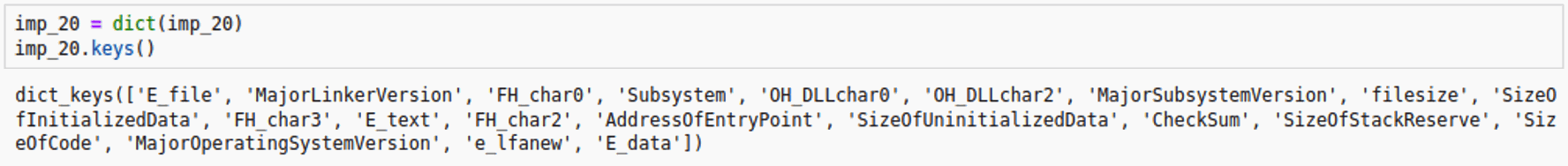이전에 추출했던 특징 중요도가 높은 순의 pe header 상위 20개가 출력된다.