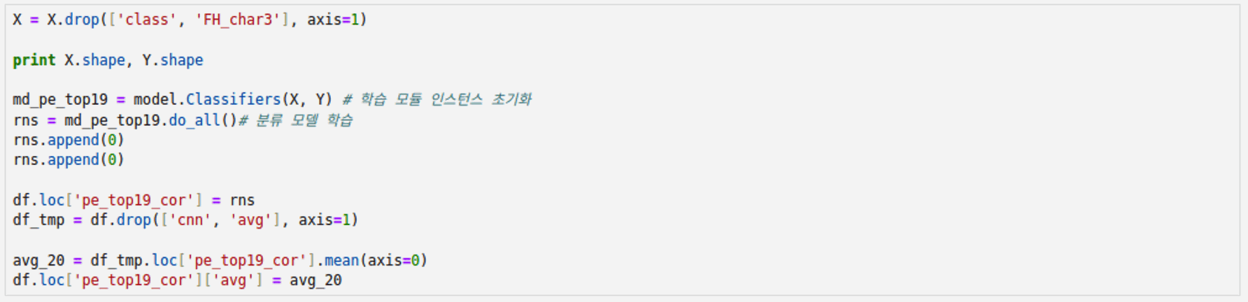 class, FH_char3열을 삭제하고 분류모델에 학습한 뒤 평균을 낸다. 그 결과를 pe_top19 행에 저장한다.