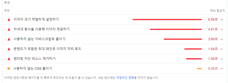 제 사이트의 모바일 성능은 48점으로 낮은 편인데, 그 원인에는 너무 큰 이미지 용량이 있습니다.