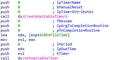 Lea edx, [esp+410h+FileTime] / push edx / call ds:SetWaitableTimer 방금 생성한 filetime값을 edx에 저장하고, 인자로 push하여 SetWaitableTimer를 호출한다.