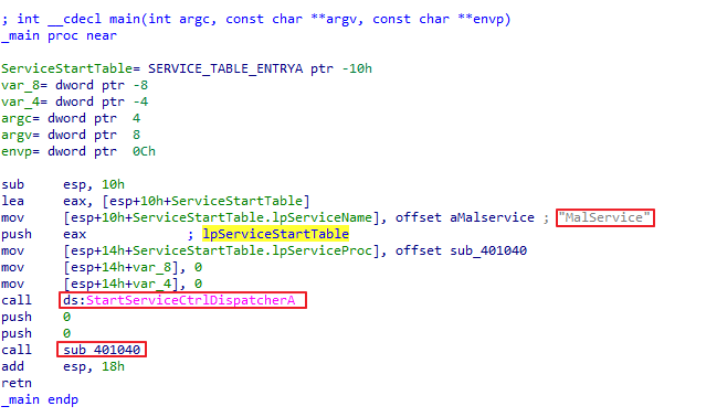 눈에 띄는 부분은 Malservice, StartServiceCtrlDispatcherA이다.