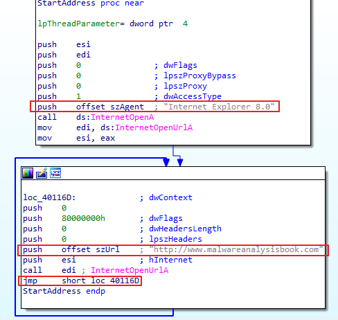 중요한 부분은 jmp short loc_40116D이다. 조건 없이 loc_40116D로 계속 점프해 반복하고 있어, http://www.malwareanalysisbook.com 에 접속하는 행위는 끝나지 않고 무한히 계속된다는 점이다.