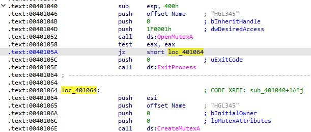 만약 뮤텍스가 존재하지 않는다면 loc_401064로 점프하는데, call CreateMutexA함수을 사용하여 HGL345 뮤텍스를 생성하는 것을 볼 수 있다.