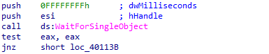 Jnz short loc_40113B : 0이 아닐 경우 대기 루틴으로 점프한다.