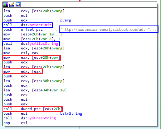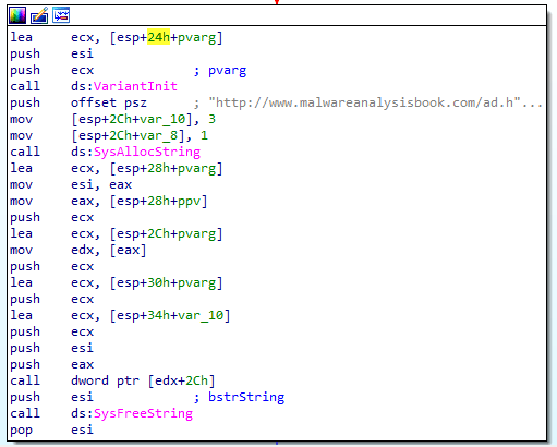 Com 객체를 생성하여 Navigate 메서드를 사용하여 http://www.malwareanalysisbook.com/ad.html 에 접속한다.