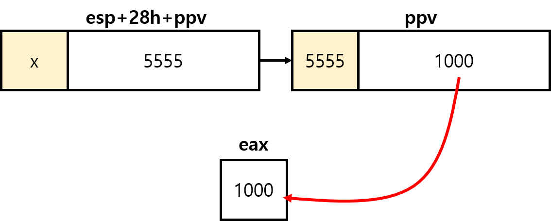 esp+28h+ppv에는 ppv변수의 주소 값이 들어있으며, [esp+28h+ppv]의 의미는 이 주소 값이 가리키는 값. 즉 ppv의 값을 뜻한다.